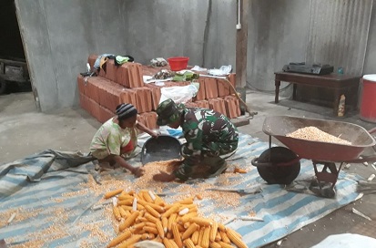 FOKUS JATENG-SUKOHARJO-Di sela-sela kesibukan dan kelelahan tersebut anggota Satgas TMMD Reguler 104 masih menyempatkan diri untuk berbuat kebaikan, Sertu Yatmo membantu masyarakat menjemur jagung hasil panen di halaman rumah ibu Hajah Rosmini Rt 1/ Rw V Dukuh Sambirejo Desa Celep Kecamatan Nguter Kabupaten Sukoharjo. Senin (18/03/2019).