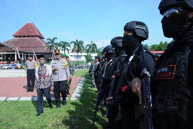 Kapolres membacakan amanat tertulis dari Menteri Koordinator Politik Hukum dan Keamanan dalam kegiatan yang bertujuan untuk mengecek kesiapan TNI, Polri dan komponen Masyarakat dalam rangka pengamanan kampanye terbuka dan pemungutan suara Pemilihan Umum (Pemilu) 2019.
