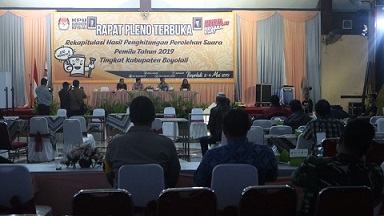 FOKUS JATENG-BOYOLALI-Komisi Pemilihan Umum (KPU) Boyolali menyelesaikan rapat pleno terbuka rekapitulasi Pemilu 2019 di Gedung Sasono Mulyo Wiguno Jalan Solo-Semarang KM 24, Kelurahan/Kecamatan Mojosongo, Senin 6 Mei 2019.