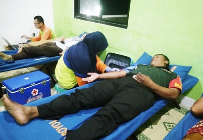 FOKUS JATENG-BOYOLALI-Anggota Koramil 14/Klego Kodim Boyolali berpartisipasi dalam kegiatan bakti sosial donor darah yang diselenggarakan oleh Remaja Masjid Al Hidayah Dukuh Ngliyangan RT. 27 RW. 06 Desa Banyuurip Kecamatan Klego dan PMI Kabupaten Boyolali. Kegiatan tersebut dilaksanakan setelah pelaksanaan sholat Tarawih. Rabu 15 Mei 2019.