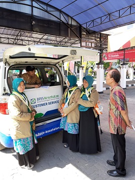 FOKUS JATENG-BOYOLALI-Dalam rangka meningkatkan pelayanan bagi jamaah haji dan petugas haji peserta JKN-KIS pada periode keberangkatan haji tahun 2019, BPJS Kesehatan Boyolali membuka layanan pendaftaran, perubahan data, pemberian informasi dan penanganan pengaduan melalui keberadaan Mobile Customer Service dan Anjungan Mobile JKN di asrama haji Donohudan Boyolali.