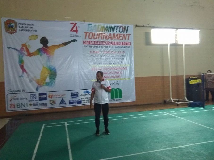 FOKUSJATENG – KARANGANYAR – Memperingati hari Kemerdekaan RI, Perusahaan Umum Daerah Air Minum (PUDAM) Karanganyar menggelar lomba cabang olahraga bulu tangkis di Gor Nyai Ageng Karang, Selasa (6/8/2019). Digelar hanya satu hari, lomba ini diikuti oleh seluruh Kepala Organisasi Perangkat Daerah (OPD) serta seluruh staf di masing-masing OPD di Karanganyar.