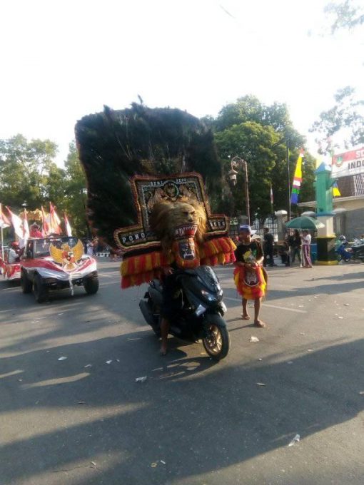 Namun, di media sosial beredar foto unik yang diduga merupakan salah satu peserta karnaval. Ya, dalam foto yang diunggah pemilik akun Pakdhe Cemoeck tersebut nampak Singobarong tampil garang, tapi tidak bermain tari reog di sepanjang rute pawai, tetapi mengikuti arus pawai dengan mengendarai sepeda motor.
