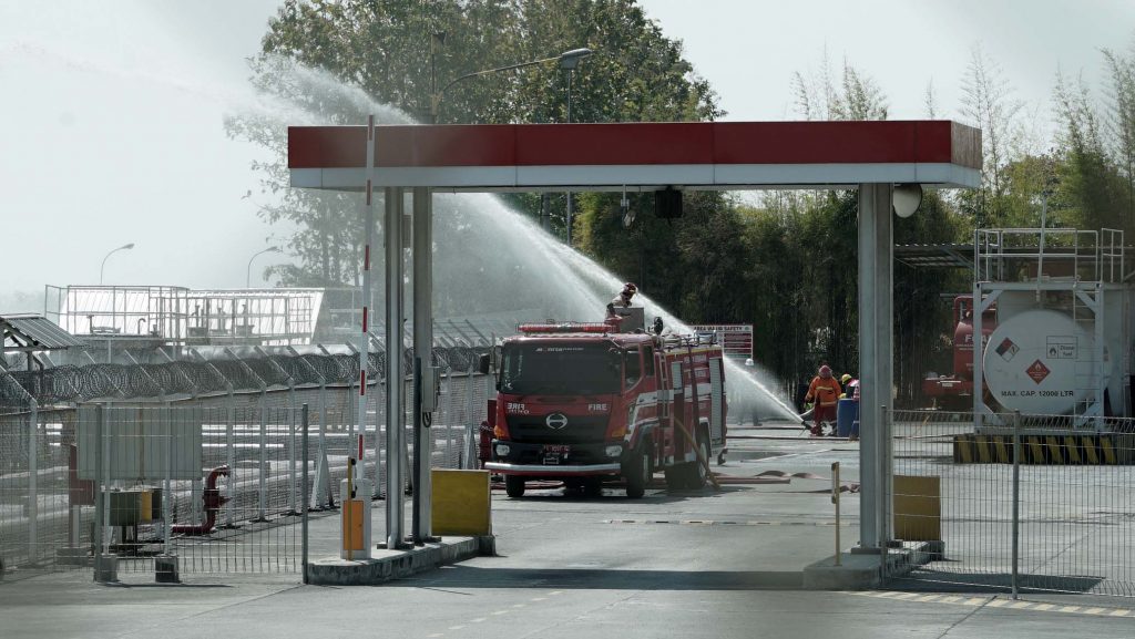 Disimulasikan, adanya nyala api di dekat tangki penimbunan BBM. Sirine tanda bahaya pun langsung berbunyi. Api langsung diketahui pekerja yang dengan cepat menyemprotkan alat pemadam ringan (Apar).