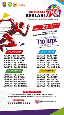 Even tahun ke-4 kali ini, Boyolali Berlari yang akan digelar Minggu (22/9/2019), akan memperebutkan total hadiah Rp 110 juta. Boyolali Berlari 7K tahun ini terdiri dari kategori umum putra dan putri, serta pelajar putra dan putri.
