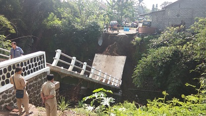 FOKUS JATENG-BOYOLALI-Diguyur hujan deras yang terjadi sejak sore hingga pagi hari, jembatan penghubung dua dukuh antara dukuh pusung dengan Surodadi di Kelurahan Banaran, Kecamatan Boyolali Kota ambrol.