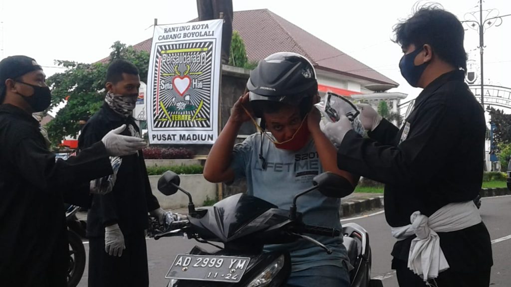 FOKUSJATENG – BOYOLALI – Ditengah pandemi corona, warga Persaudaraan Setia Hati Terate (PSHT) Pusat Madiun Cabang Boyolali menggelar aksi sosial membagikan seribu masker secara gratis kepada pengguna jalan, mereka juga memberikan imbauan untuk jaga jarak, jaga kondisi agar terhindar dari wabah covid 19 di Boyolali, Kamis (21/5/ 2020).