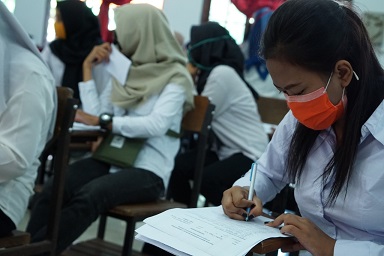 Berbeda dengan biasanya, kali ini ratusan peserta seleksi tahap pertama Pelatihan Berbasis Kompetensi (PBK) diwajibkan untuk menggunakan masker saat mengikuti pelatihan dan protokol kesehatan lainnya untuk mencegah penyebaran Covid-19.