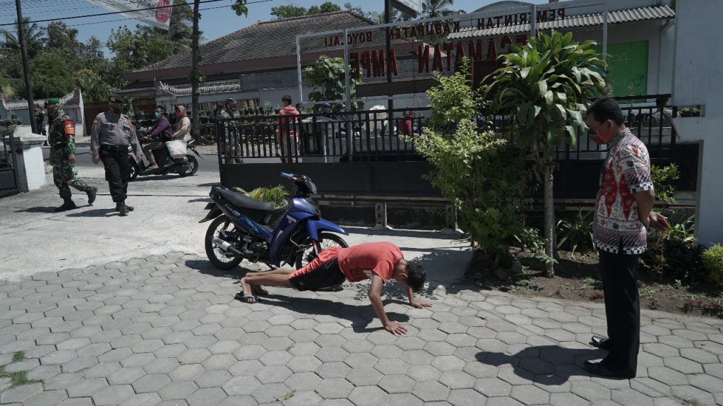 FOKUS JATENG-BOYOLALI-Sejumlah pengendara kendaraan terjaring razia masker di Jalan Boyolali- Semarang, tepatnya wilayah Kecamatan Ampel. Para pelanggar protokol kesehatan Coronavirus Disease atau Covid-19 didata dan dikenai sanksi push up dan menghapal lapal Pancasila.