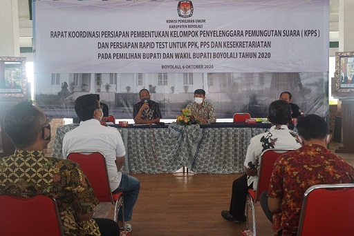 FOKUS JATENG-BOYOLALI-Komisi Pemilihan Umum (KPU) Kabupaten Boyolali menggelar Rapat Koordinasi Pembentukan Kelompok Penyelenggara Pemungutan Suara (KPPS) dan Persiapan Rapid Test Untuk Panitia Pemilihan Kecamatan (PPK), Panitia Pemungutan Suara (PPS), dan Kesekretariatan. Kegiatan tersebut dipusatkan di Pendopo Gede Kabupaten Boyolali, pada Selasa (6/10/2020).
