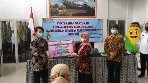 FOKUS JATENG-BOYOLALI-Ahli waris badan adhoc (penyelenggara) Pemilihan Bupati dan Wakil Bupati 2019 Kabupaten Boyolali yang mengalami kecelakaan kerja menerima santunan dari Komisi Pemilihan Umum (KPU) Kabupaten Boyolali. Bertempat di aula KPU Kabupaten Boyolali, Rabu (3/2/2021) terdapat enam ahli waris yang menerima santunan.