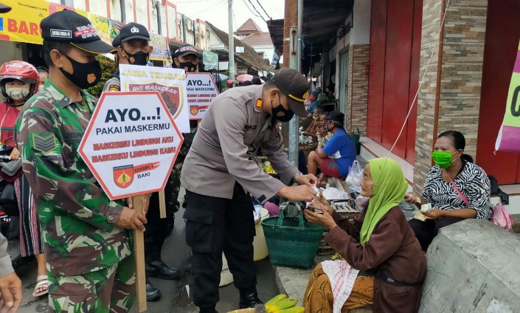 Di wilayah Kecamatan Baki, puluhan anggota Polsek Baki dipimpin Kapolsek Baki, AKP Riyadi Supriyadi mendatangi pasar tradisional Daleman yang berlokasi diperbatasan dengan wilayah Kecamatan Wonosari, Kabupaten Klaten, Kamis (4/2/2021).