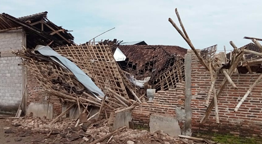 Kondisi atap dan rangka bangunan dari bambu roboh hampir rata dengan tanah dengan genting pecah berserakan. Umur bangunan yang sudah tua dan rapuh diperkirakan tidak kuat menahan beban air hujan.