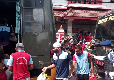 Sementara itu, seluruh warga binaan diangkut dengan mobil tahanan berupa tiga bus dan dua mobil minibus khusus untuk angkutan tahanan. Di bawah pengamanan ketat petugas Rutan, TNI dan Polri, para warga binaan dibawa masuk ke dalam mobil tahanan yang parkir di depan Rutan. Pemindahan dengan tetap menerapkan protokol kesehatan.
