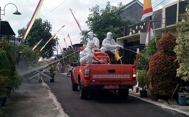 Sehingga penyemprotan dilakukan petugas dengan mengenakan pakaian alat pelindung diri yang lengkap. Mereka dalam kegiatan itu naik mobil bak terbuka. Sejumlah petugas dengan membawa tangki plastik berjalan secara pelan-pelan menyemprotkan disinfektan hingga lorong-lorong perumahan. “Mobil water canon tak bisa masuk karena jalan yang sempit,” imbuhnya.