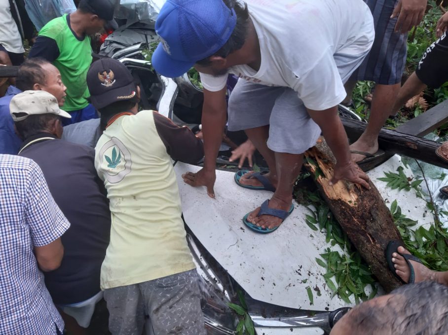FOKUS JATENG-BOYOLALI-Hujan lebat disertai angin kencang yang melanda wilayah Banyudono mengakibatkan seorang penumpang mobil Toyota Agya Warna Putih Nomor polisi AD 9353 QR tewas tertimpa pohon. Proses evakuasi jenasah korban memakan waktu cukup lama, karena korban terjepit dalam mobil.