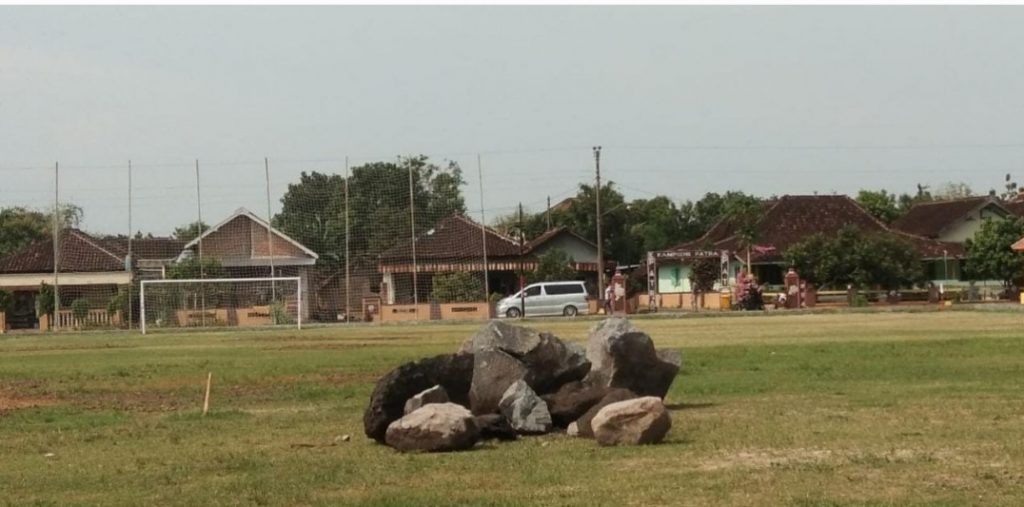 FOKUS JATENG. COM ,Karanganyar – Sebuah pemandangan tidak mengenakan terjadi di Lapangan Desa Suruh Kalang, Kecamatan Jaten, Karanganyar. Pasalnya, ditengah hamparan rumput hijau itu terdapat setumpuk batu-batu besar yang sangat mengganggu aktivitas olah raga, khususnya sepak bola.