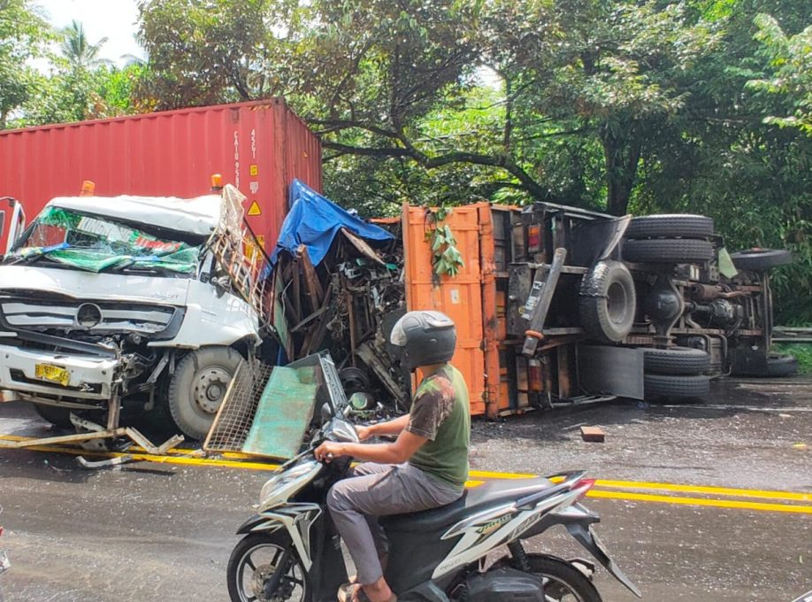 Truk itu baru berhenti, bahkan terbalik setelah menghantam truk kontainer bernopol B 9750 KEH di belakangnya.