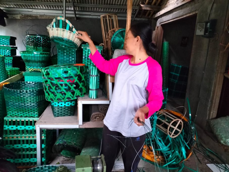 Hanya saja produk anyaman itu bukan dari bambu atau rotan, akan tetapi terbuat dari bahan plastik limbah atau tali klem bekas.