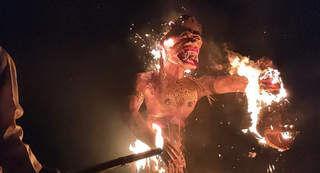 Ogoh – ogoh raksasa dengan taring yang menjulur keluar mulut itu melambangkan enegi jahat.