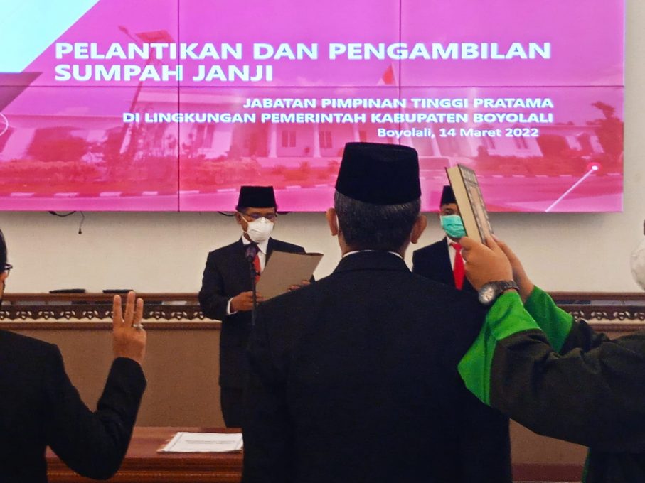 FOKUS JATENG-BOYOLALI-Lima pejabat Pimpinan Tinggi Pratama (Eselon II) di lingkungan Pemerintah Kabupaten (Pemkab) Boyolali dirotasi dengan pelantikan dan pengambilan sumpah janji. Dalam pelantikan yang dilaksanakan di Ruang Merbabu Kantor Bupati Boyolali pada Senin (14/3/2022) . Pelantikan dan pengambilan sumpah bagi pejabat Pimpinan Tinggi Pratama dilakukan oleh Bupati Boyolali, M. Said Hidayat.