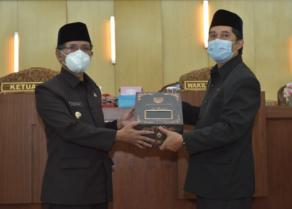 Bupati Boyolali M. Said Hidayat menyerahkan laporan LKPJ 2021 kepada Ketua DPRD Boyolali Marsono (yulianto/Fokusjateng.com)