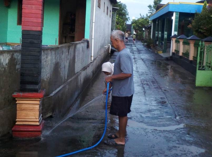 Warga pun tanpa lelah langsung membersihkan lumpur tersebut. Lumpur disemprot dengan air ke arah selokan.