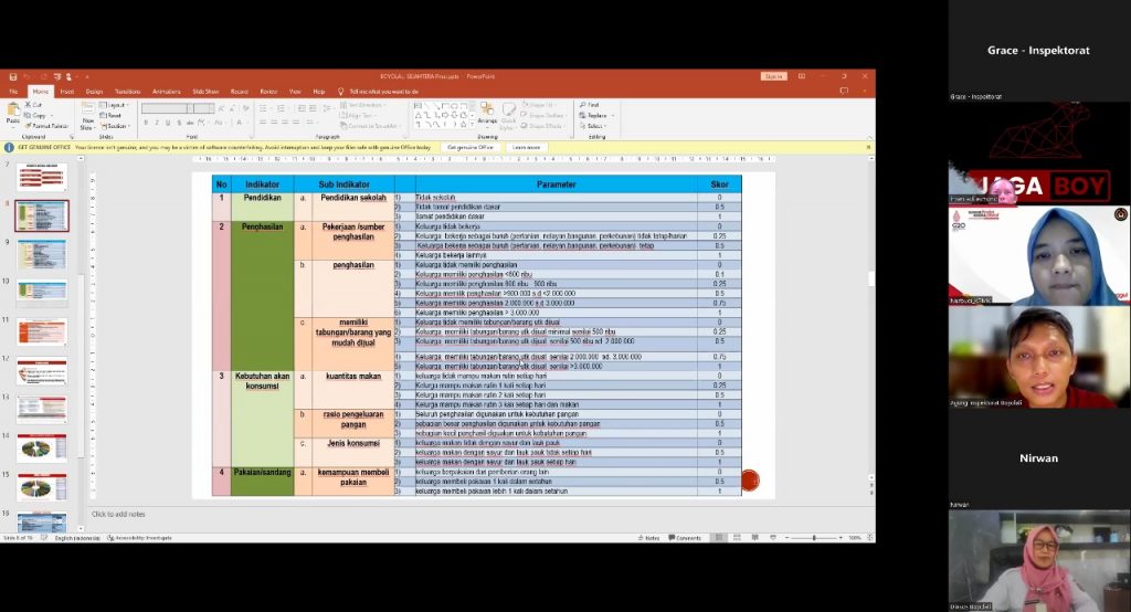 “Rencana penyandingan data pusat dan daerah bertujuan untuk mendapatkan mapping per-individu dan bukan lagi per-KK yang menghasilkan data konsolidasi,” papar Agung dalam meeting yang diikuti Inspektorat Boyolali dan dipandu dari Kemenko PMK yang menyampaikan paparan tentang Sejarah P3KE dalam Langkah Penghapusan Kemiskinan.