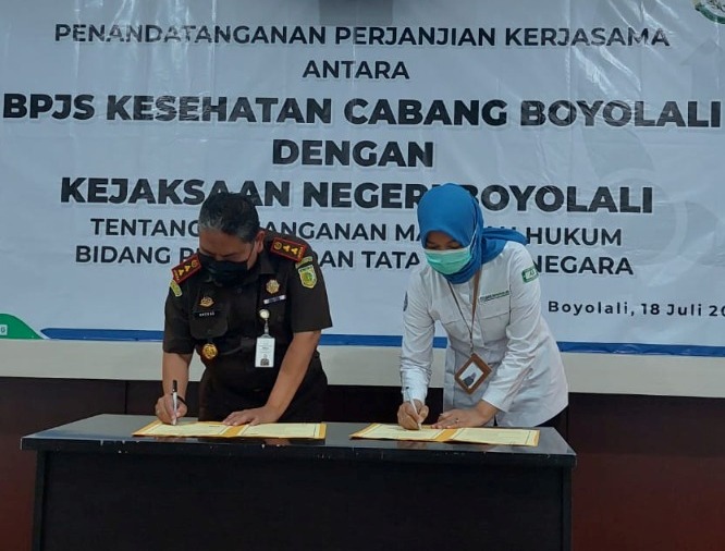 FOKUS JATENG-BOYOLALI-Kejaksaan Negeri Boyolali bersama Badan Penyelenggara Jaminan Sosial (BPJS) Kesehatan Cabang Boyolali tanda tangan nota kesepahaman bersama dalam bidang Penanganan Masalah Hukum Bidang Perdata Dan Tata Usaha Negara.