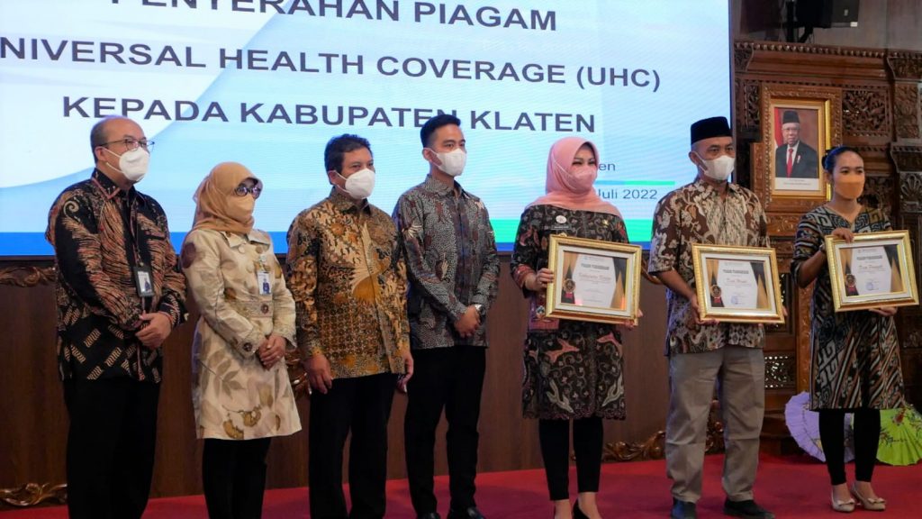 Direktur Utama BPJS Kesehatan, Ghufron Mukti menyerahkan langsung Piagam UHC kepada Bupati Klaten, Sri Mulyani di Pendopo Bupati Klaten, Jumat 29 Juli 2022. Penyerahan disaksikan oleh jajaran Organisasi Perangkat Daerah (OPD) Kabupaten Klaten dan kepala daerah se-Solo Raya.