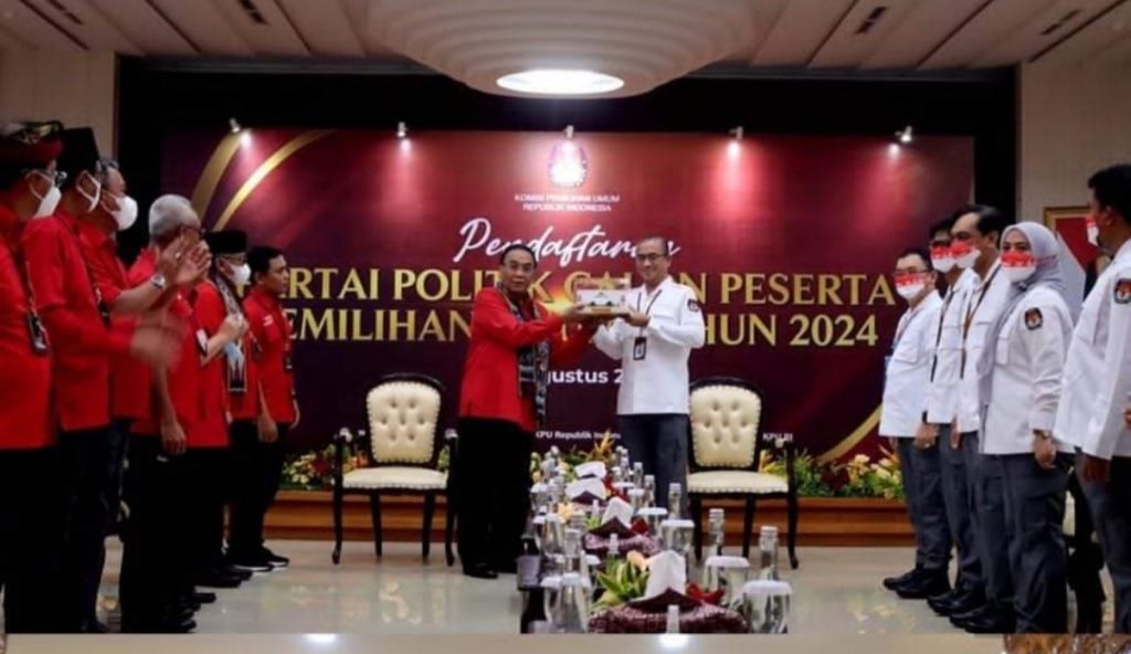Serah terima dilakukan di dalam gedung KPU di Jalan Imam Bonjol, Jakarta Pusat, Senin (1/8/2022). Jajaran PDIP hadir dipimpin oleh Hasto. Dia didampingi Bambang Wuryanto (Ketua DPP Partai Bid. Pemenangan Pemilu); Komarudin Watubun (Ketua DPP Partai Bid. Kehormatan Partai), Djarot Saiful Hidajat (Ketua DPP Partai Bid. Ideologi dan Kaderisasi), Sukur H. Nababan (Ketua DPP Partai Bid. Organisasi); Ahmad Basarah (Ketua DPP Partai Bid. Luar Negeri), Sri Rahayu (Ketua DPP Partai Bid. Kesehatan, Perempuan & Anak), Utut Adianto (Wakil Sekjen Bid. Internal), Arif Wibowo (Wakil Sekjen Bid. Pemerintahan), Sadarestuwati (Sekjen Bid. Kerakyatan) dan Prasetyo Edi Marsudi.