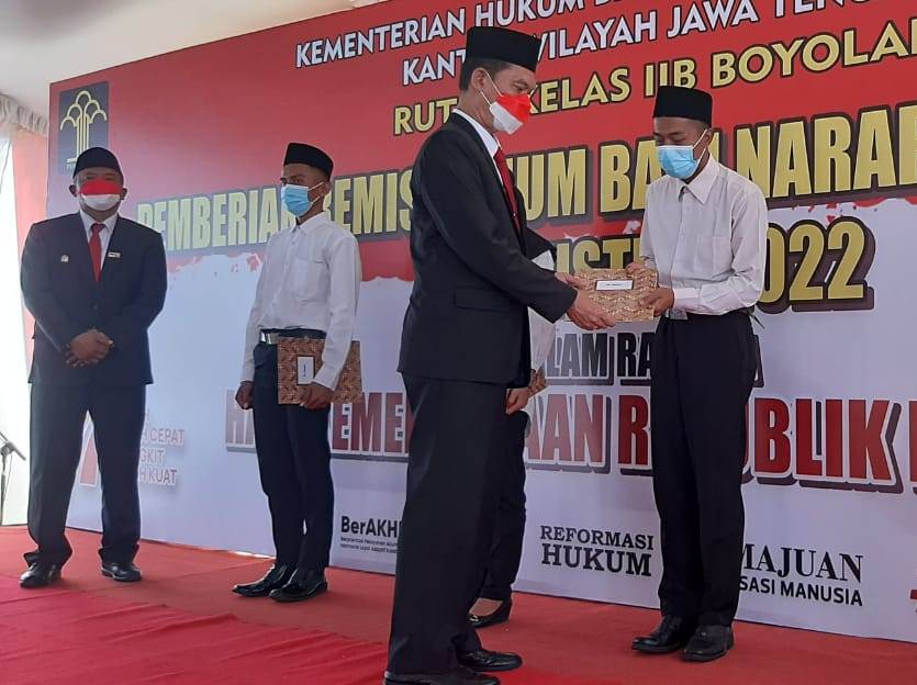 FOKUS JATENG-BOYOLALI- HUT ke-77 RI, sebanyak 81 warga binaan pemasyarakatan di Rutan Kelas II B Boyolali mendapatkan remisi. Pemberian SK remisi ini diserahkan secara simbolis oleh Wakil Bupati Boyolali, Wahyu Irawan, Kepala Kejaksaan Negeri (Kajari), Anshar Wahyuddin.