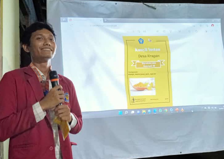 Dalam kegiatan pengabdian ini mahasiswa KKNT kelompok 29 Desa Kragan, Kecamatan Gondangrejo, Kabupaten Karanganyar telah menyelenggarakan sosialisasi mengenai sistem pengemasan dan labeling produk dalam pengembangan hasil produksi serbuk kunyit instan. Kegiatan yang dilaksanakan pada hari Sabtu (20/8) merupakan program kerja individu dari mahasiswa KKNT MBKM kelompok 29 dibawah bimbingan Bapak Muadz, S. Sn., MA sebagai Dosen Pembimbing Lapangan.