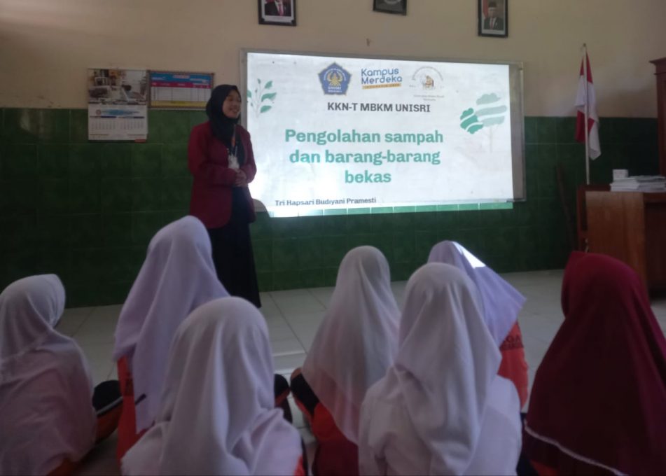 lingkungan hidup. Oleh karena itu salah satu cara yang sering dilakukan untuk mengatasi sampah plastik adalah dengan melakukan proses 3R yaitu Reduce (mengurangi sampah), Reuse (menggunakan kembali sampah) Recycle (mendaur ulang sampah). Demikian ungkap Tri Hapsari Budiyani Pramesti mahasiswi KKNT MBKM Universitas Slamet Riyadi Surakarta kelompok 29 saat sosialisasi dan pelatihan ini di SDN 01 Kragan, Gondangrejo, Karanganyar.