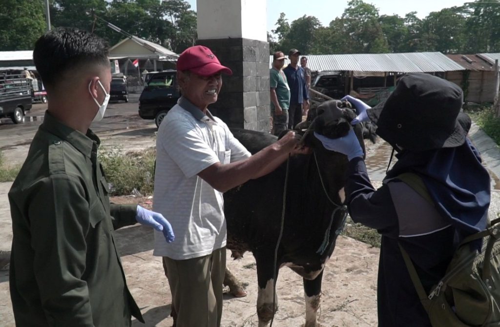 petugas dari Disnakkan Boyolali langsung memeriksa kondisi kesehatan sapi yang masuk Pasar Hewan Jelok Boyolali (yull/Fokusjateng.com)