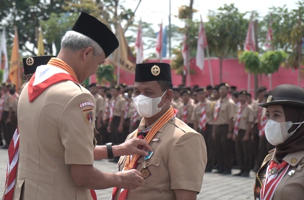 Puncak peringatan hari Pramuka: Penyematan tanda penghargaan Pramuka Pancawarsa oleh Gubernur Ganjar sekaligus Ketua Majelis Pembimbing Daerah (Kamabida) Jawa Tengah, salah satunya Ketua Kwarcab Boyolali, Supana. (yull/Fokusjateng.com)