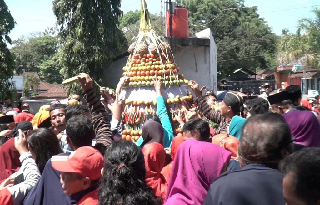 Gunungan hasil bumi pun langsung diserbu warga. Dalam tempo sekejap, aneka buah- buahan dan sayuran gunungan pun ludes. (yull/Fokusjateng.com)