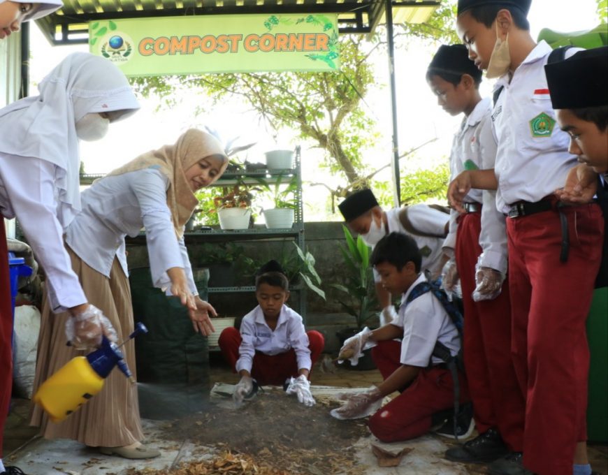 Para siswa MIN Salatiga praktik pembuatan kompos di Compos Corner UIN Salatiga (doc.verary/Fokusjateng.com)