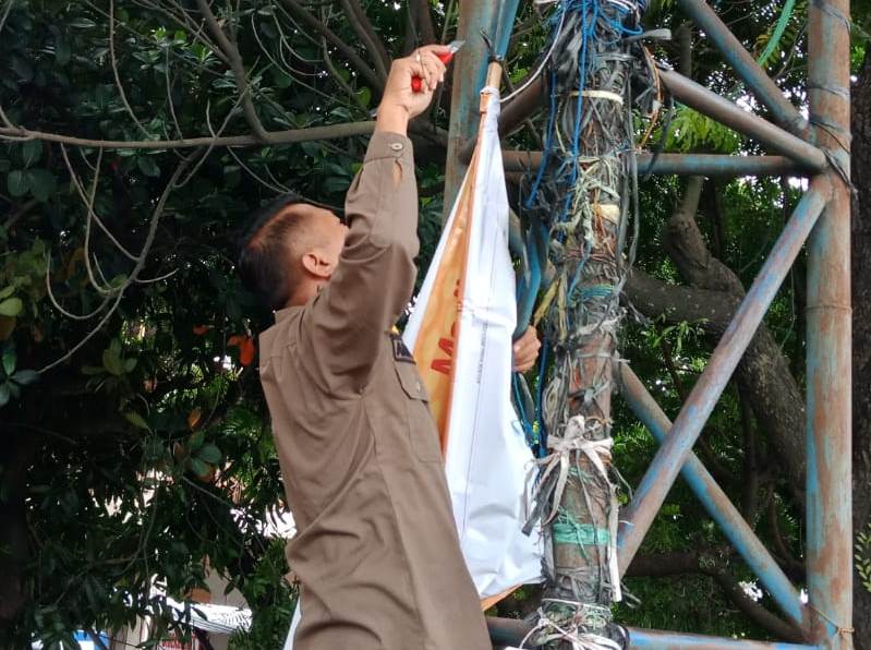 Petugas Satpol PP Boyolali mencopot baliho maupun reklame yang menyalahi aturan. (yull/Fokusjateng.com)