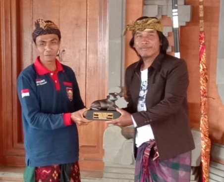 Penyerahan cenderamata Kepala Desa Cabean kunti kepada Pemerintah Desa Bayung Gede diwakili Bendesa (Ketua Adat Desa) Ketut Sukarta (doc.bhs/Fokusjateng.com)