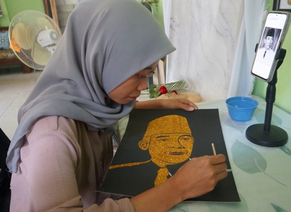 Erine tengah merampungkan sebuah lukisan wajah presiden pertama Indonesia Ir Soekarno (yull/Fokusjateng.com)