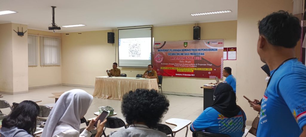 “Ke depan, KTP tidak hanya berbentuk fisik, tetapi juga berbentuk digital. Itulah yang akan diperkenalkan,” ungkap Kepala Disadmindukcapil Kota Surakarta, Yuhanes Pramono, S.H, M.Si saat memberi sambutan pada kegiatan Workshop Pelayanan Administrasi Kependudukan secara Online bagi Mahasiswa di Kampus Universitas Setia Budi (USB), Kamis (24/11/2022).