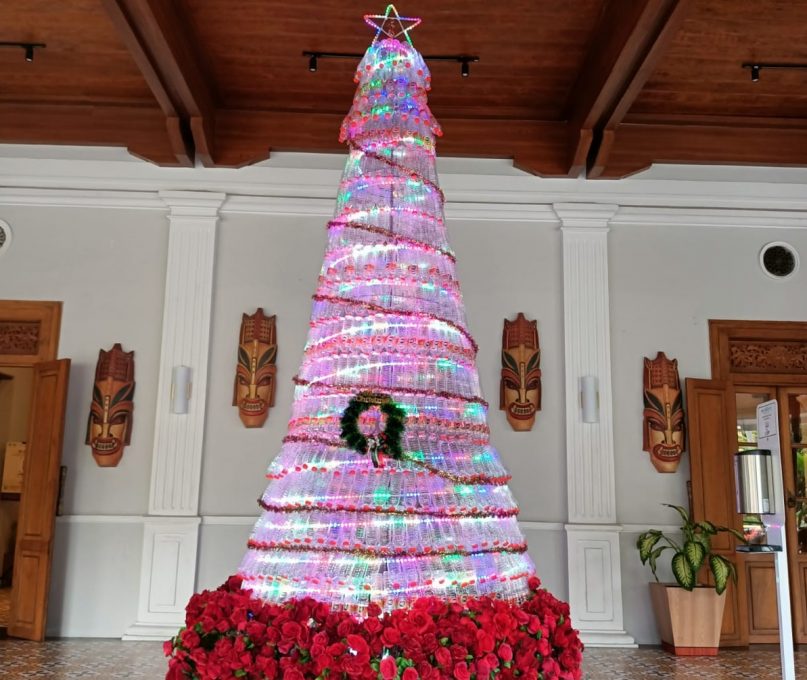 Solia Yoso memajang pohon Natal ukuran besar di teras depan Pendopo. “Kami memanfaatkan botol bekas air mineral untuk menghiasi pohon Natal setinggi sekitar 5 meter,” terang Lisa.