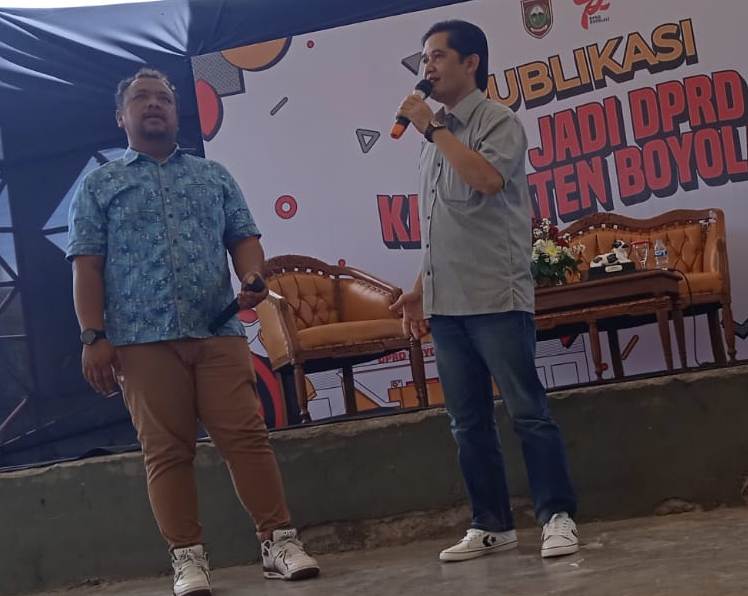 Abah Lala (kiri) bersama ketua DPRD Boyolali Marsono saat Launching rangkaian peringatan Hari Jadi ke-72 DPRD Boyolali di Gedung Anurogo Boyolali. (yull/Fokusjateng.com)
