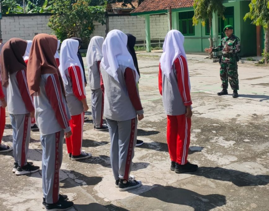 FOKUS JATENG-BOYOLALI- Tiga Anggota Koramil 18/Kemusu Kodim 0724/Boyolali dipimpin oleh Batiwanwil Koramil Kemusu Serma Riya memberikan materi Bela Negara yang dilanjutkan kegiatan Pelajaran Baris Berbaris (PBB)kepada puluhan siswa-siswi SMP N I Kemusu Jl. Cepresen –Juwangi Desa Klewor Kecamatan Kemusu Kabupaten Boyolali, pada Senin 9 Januari 2023.