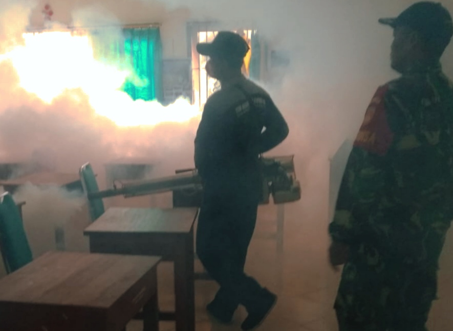 Melalui Babinsa gerakan fogging ini dilaksanakan sebagai langkah antisipasi menekan berkembangbiaknya nyamuk Aedes aegypti.