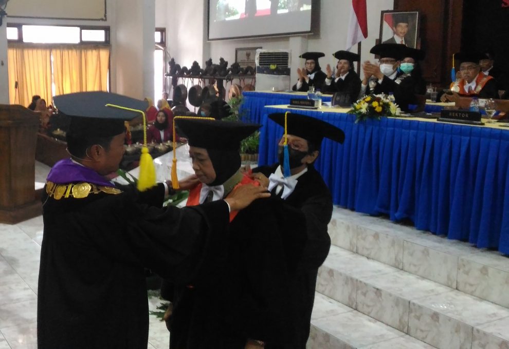 “Saya berterima kasih ke almarhum Pakde Prof Drs Suhardi, beliau mantan Koordinator Kopertis Wilayah VI Jawa Tengah yang telah mengajarkan kepada saya bagaimana menjadi seorang guru yang bertanggungjawab,” ujar Prof Winarti sembari menahan tangis haru, saat memberikan Orasi Ilmiahnya, Senin (30/1/2023).