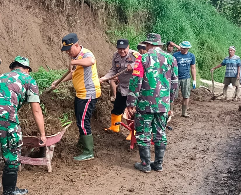 “Kami bersama masyarakat gotong-royong membersihkan sisa-sisa longsoran tanah. Ini sebagai bentuk sinergitas TNI Polri dalam kepedulian terhadap warga terdampak longsor,”ujar Dalmadi. (ist)