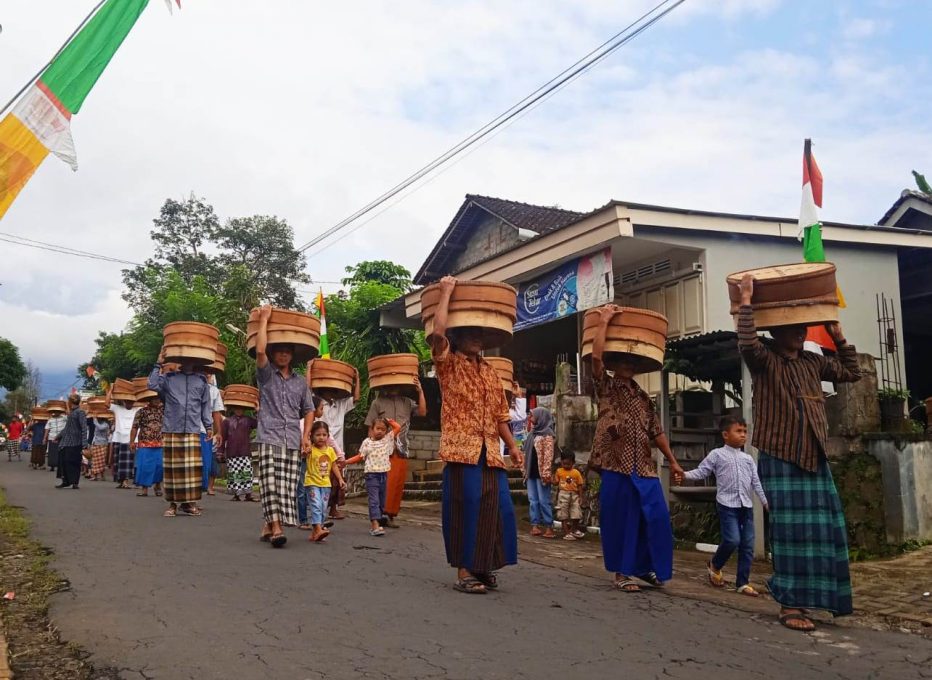 Ratusan warga dengan membawa tenongan dari bambu yang berisi makanan tradisional, seperti ayam ingkung, sambal goreng ati, urap sayur dengan lauk rempah, perkedel, tempe, tahu bacem, hingga berbagai macam buah-buahan sepeti kelengkeng anggur, jeruk dan jajanan pasar.