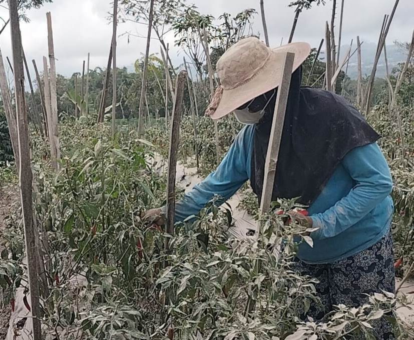 Ia menambahkan petani mengalami kerugian karena kualitas cabai menurun selama hujan belum turun dan membersihkan abu yang masih mengendap di tanaman cabai.